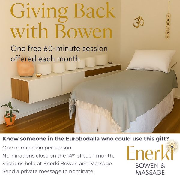 For the next 12 months, I will gift a free 60-minute Bowen Therapy session (valued at $85) to someone in the Eurobodalla who could use a little extra care.